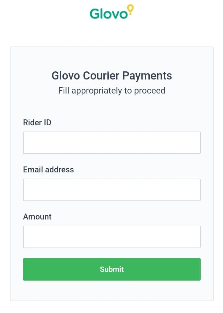 First and foremost, you need to visit the Glovo Paystack Link at "https://terminal-forms.paystackintegrations.com/form/page.html", and fill in your details including your "Rider ID", your "Glovo Email Address", and the "Amount" you want to remit.
